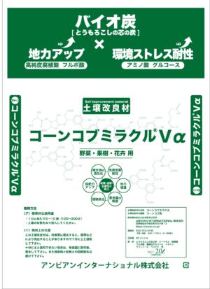 コーンコブ炭の特質を活用し、さらに植物の生育を高めるために独自の製法で編み出したオリジナルの水溶液を添加しています。原料は、高純度の腐植酸をはじめ、フルボ酸、ミネラル、アミノ酸等の天然素材を使用しております。土壌に撒くだけで効果を発揮しているのは、弊社独自の研究によるものです。また、炭のpHは10以上になりますので、pH8~9に調整しております。